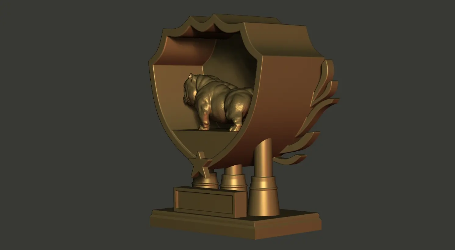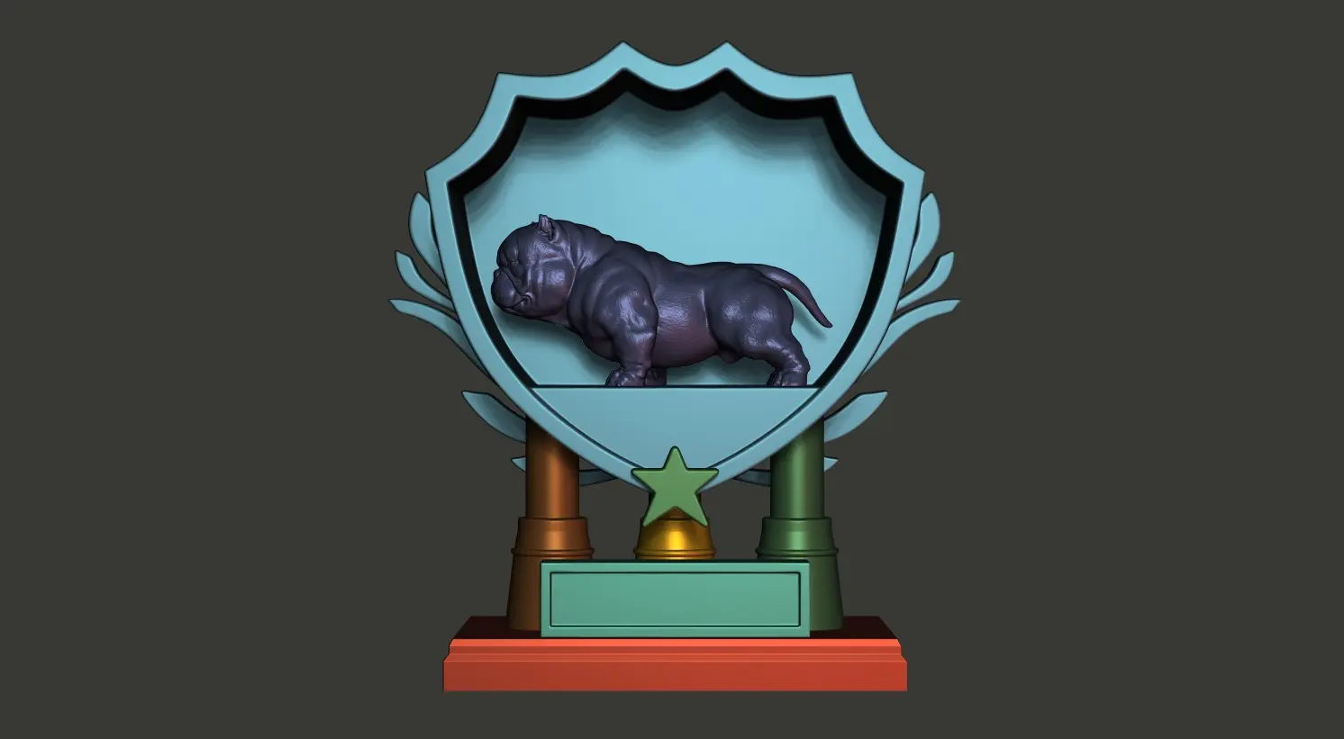 Perfecto para competiciones y eventos especiales, este trofeo es una celebración de la nobleza y majestuosidad del Bully Exótico, y una pieza que seguramente evocará admiración y orgullo en cualquier contexto.